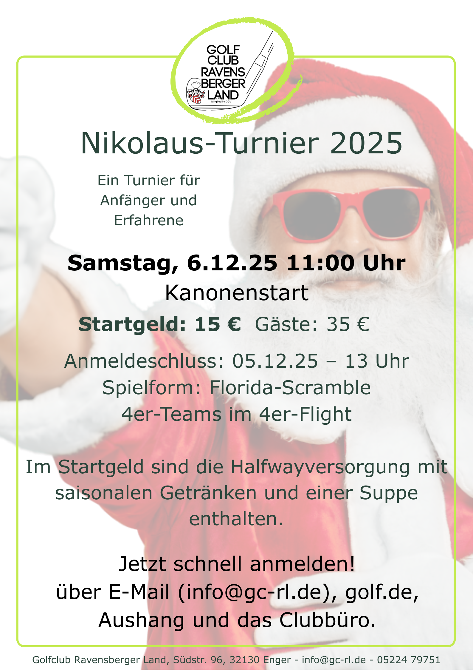 Ein Scramble Kanonenstart 11 Uhr Startgeld 15 € Rundensuppe mit saisonalen Getränken Zum Abschluss wärmen im Clubhaus Siegerehrung Eine Gemeinschaftsproduktion der Spielgruppen des Ravensberger Landes